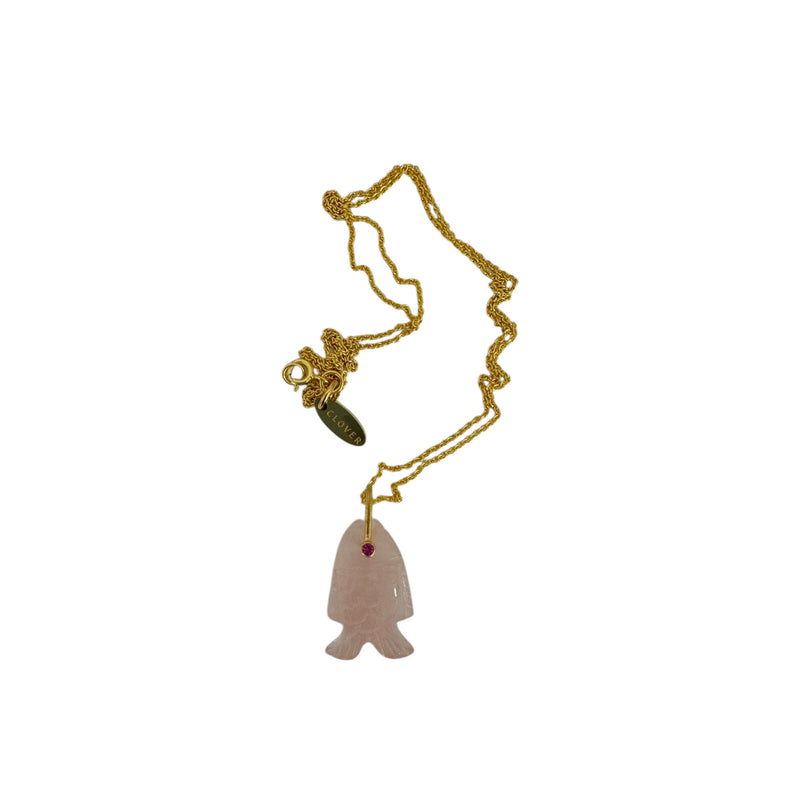 Hand carved natural rose quartz stone fish pendant with a zirconia stone eye.