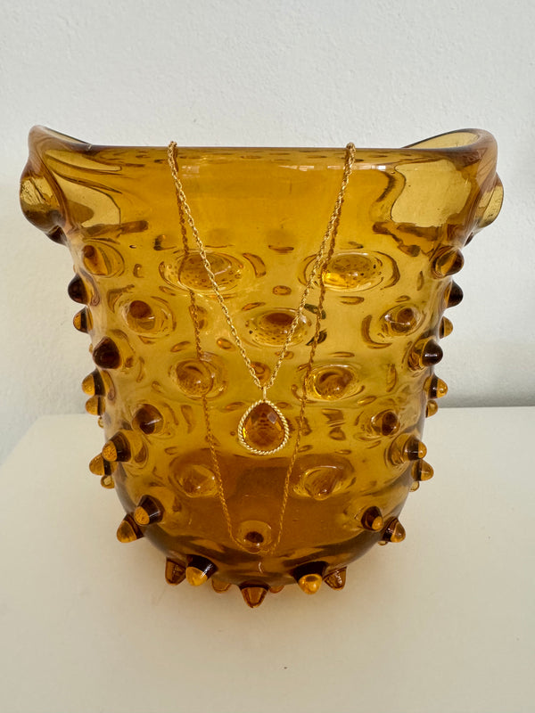 Handmade twisted gold pendant with a natural citrine stone embedded on a twisted silhouette chain.