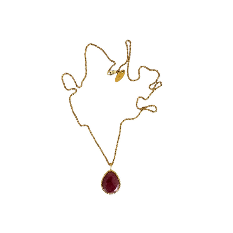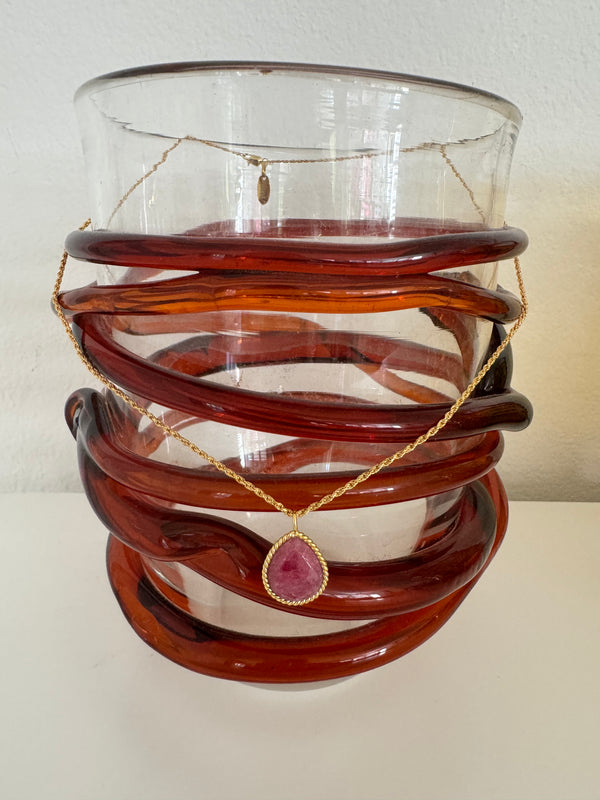 Handmade twisted gold pendant with a natural Pink Rhodonite stone embedded on a twisted silhouette chain.