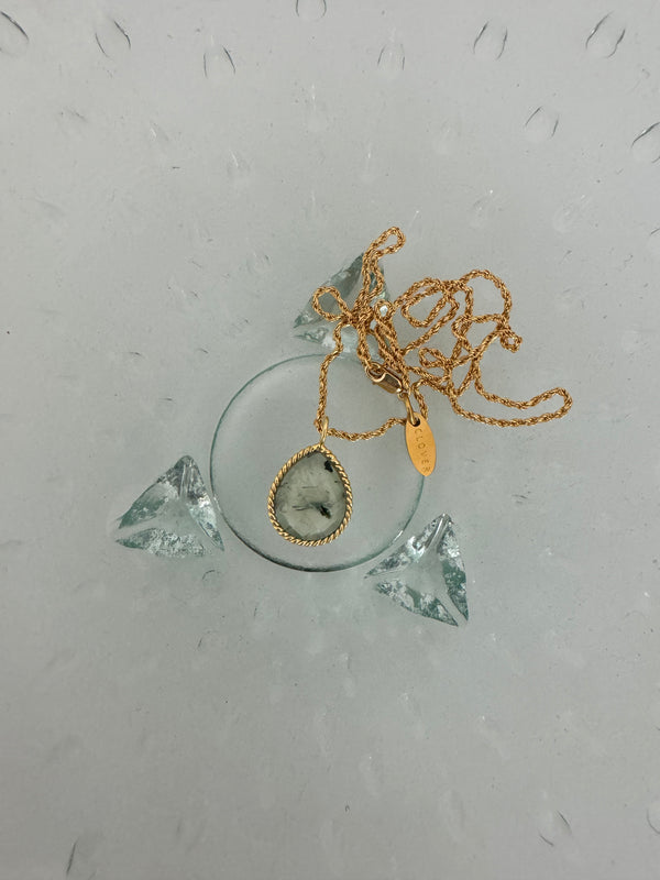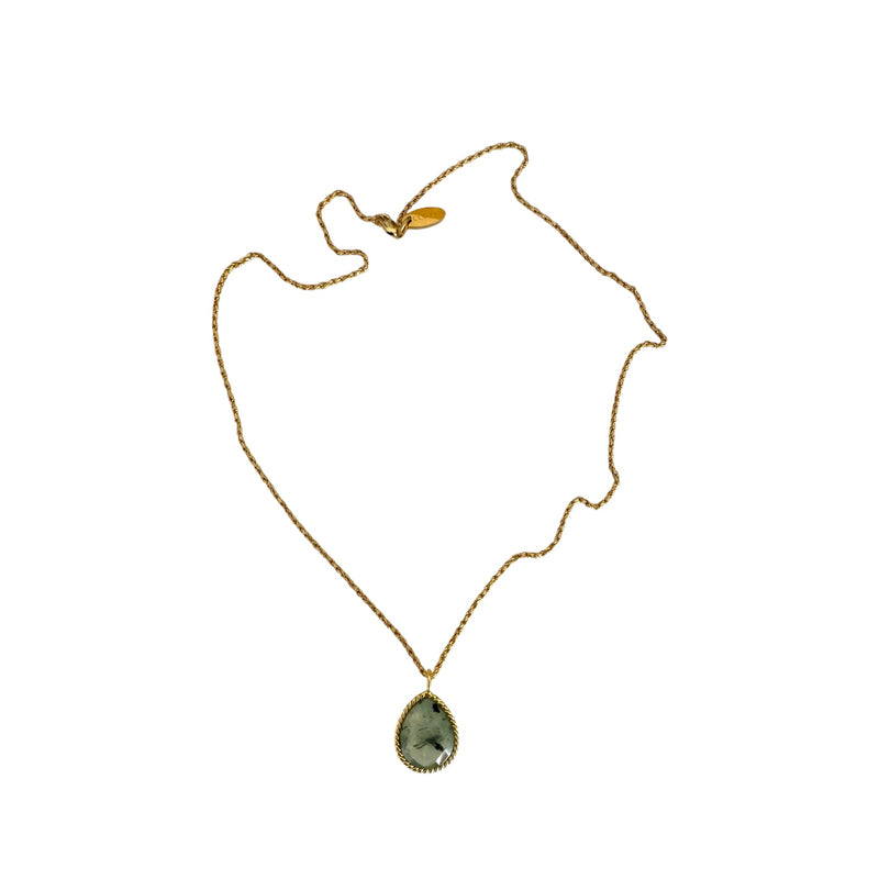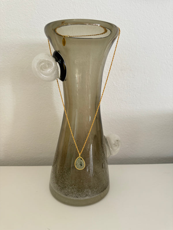 Handmade twisted gold pendant with a natural Prehnite stone embedded on a twisted silhouette chain.